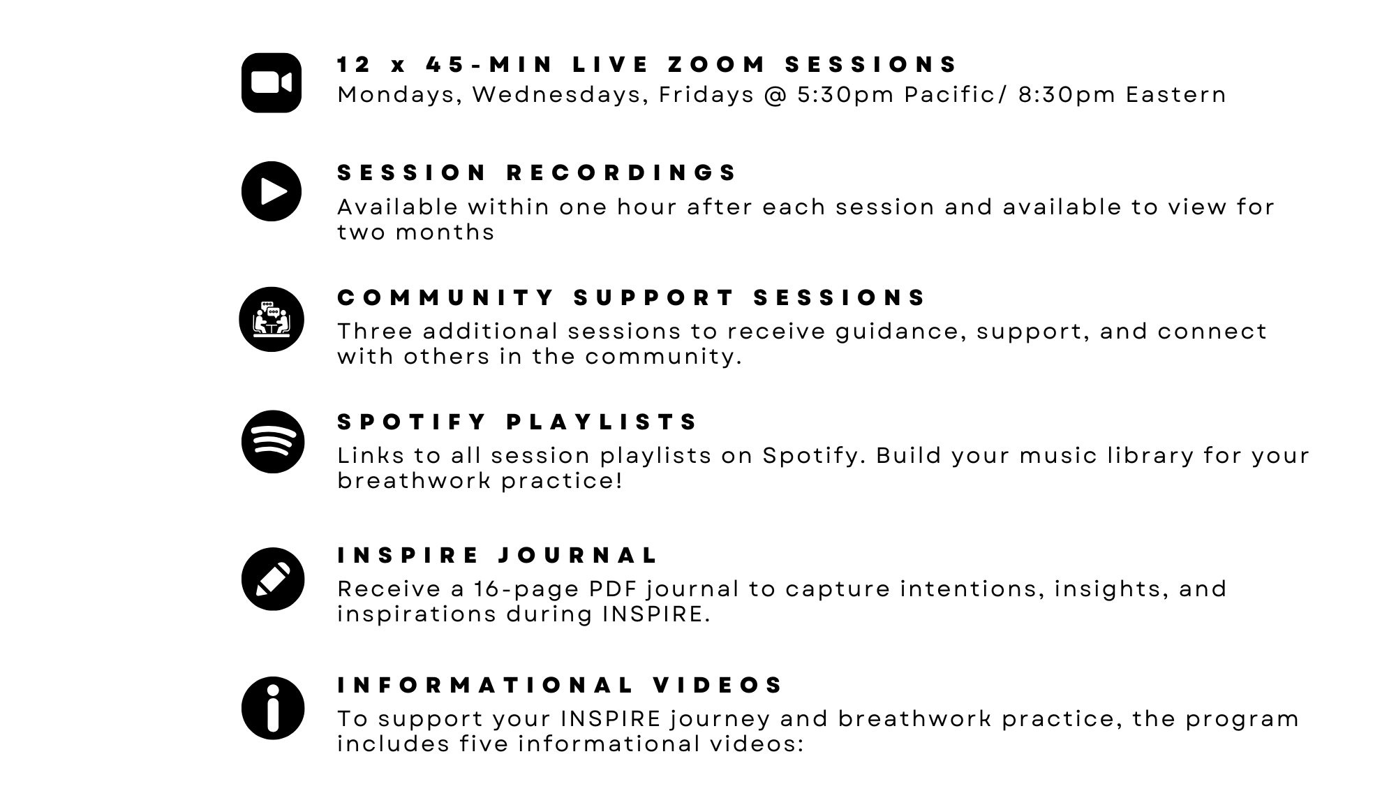 INSPIRE unfolds over four weeks and invites you into a steady, meaningful rhythm of practice, with three 45-minute conscious connected breathwork sessions each week. Each session includes a brief centering meditation, followed by ~35 minutes of active breathwork and a few minutes to quietly rest and integrate.