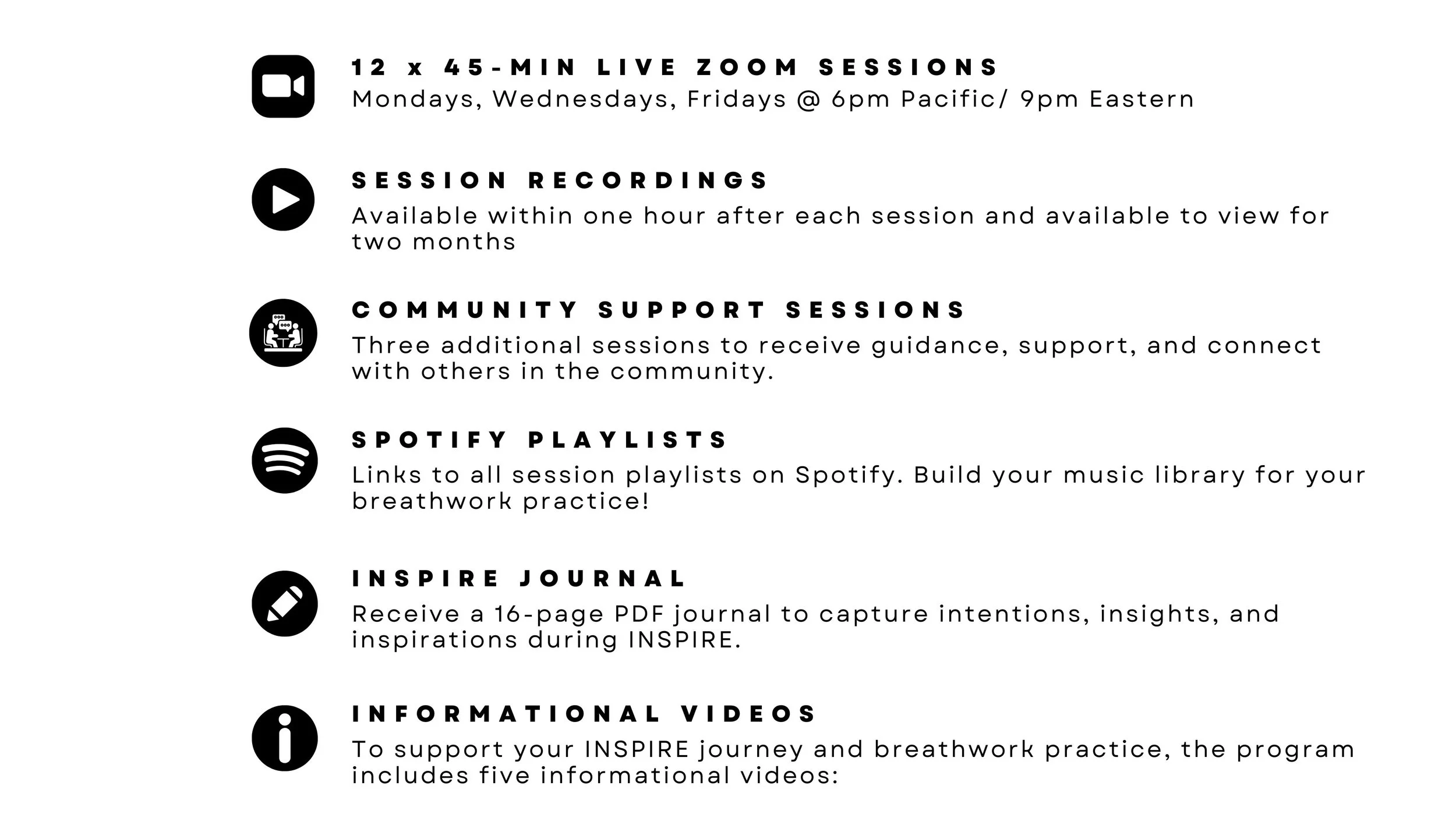INSPIRE unfolds over four weeks and invites you into a steady, meaningful rhythm of practice, with three 45-minute conscious connected breathwork sessions each week. Each session includes a brief centering meditation, followed by ~35 minutes of active breathwork and a few minutes to quietly rest and integrate.