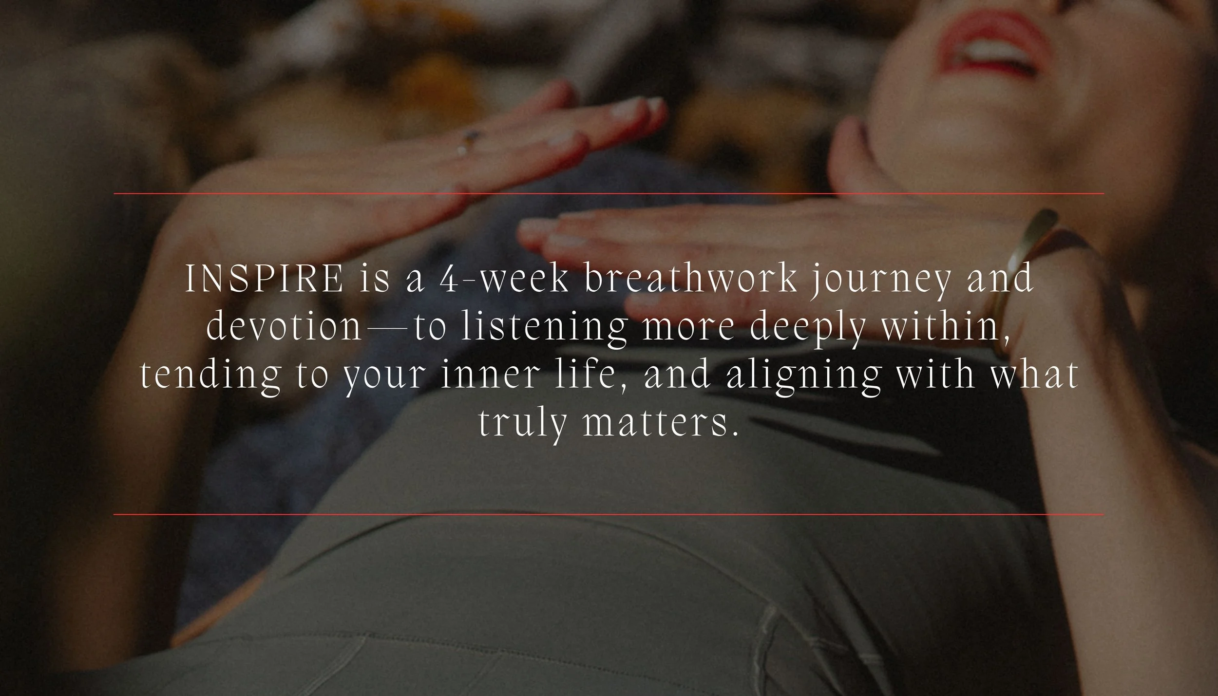 INSPIRE is a structured, supportive, and sacred container—an invitation to reconnect with your breath, your Self, and the deeper current of life moving through you.