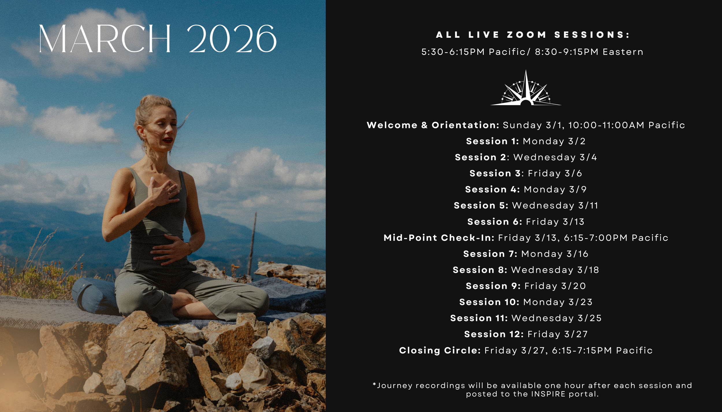 In addition to the regular breathwork sessions, the program includes a Welcome & Orientation gathering on March 1st, offering space to ask questions, receive guidance, and connect with others in the INSPIRE community. After six sessions, we’ll come together for a mid-point check-in and sharing, and the journey concludes with a Closing Gathering following the twelfth session on Friday, March 27th.